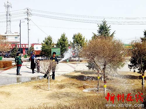 本报讯3月14日,记者在我市城区长征路上看到,园林工人手持水管,在街头小游园里细心地给草地浇水。据悉,市园林处对城区街头小游园小广场的花草树木已全面开展春季浇水工作,多名工人轮流作业一周,确保苗木春季正常返青。(张志远董子源)