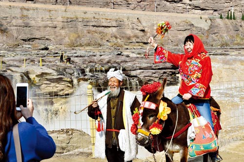 3月22日,游客在黄河壶口瀑布拍照留念。