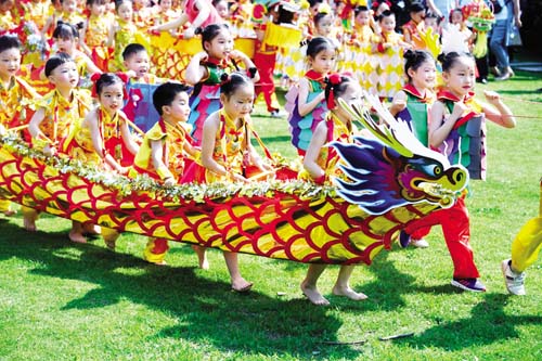 6月14日,孩子们参加旱地龙舟比赛。当日,浙江省长兴县中心幼儿园的孩子们身着传统服饰、挂上香囊,并用纸板、布匹、彩绳制作的旱地龙舟参加“划龙舟挂香囊”传统民俗迎端午的活动,感受中国传统文化的魅力,了解端午节的民俗文化。据新华社 记者 徐昱 摄