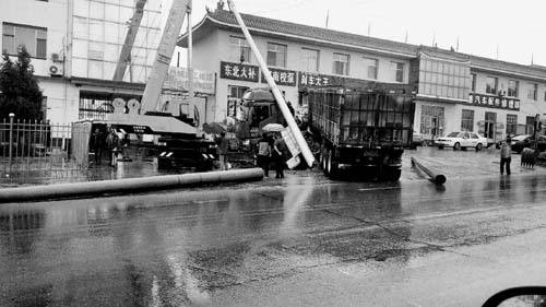 当天夜里,五台县东冶镇遭遇持续强降水天气过程,公司调控中心值班员在凌晨3时22分发现10千伏829北大街线速断掉闸,立刻电话通知所管辖区东冶供电所。得知情况后,该供电所组织抢修人员迅速赶往事故现场,勘查电杆及线路受损情况。经查勘,原来是一辆重型载货卡车在驶经五台县东冶镇时,因连夜大雨导致路面湿滑把一基电杆给撞倒了,断裂的电杆压在大卡车上,大卡车无法行驶。这一意外事件,造成了10千伏北大街线失电、沿线居民用电中断。10千伏829北大街线是东冶镇街道主要干线,生产任务繁重,能否尽快恢复送电直接关乎沿线居民的切身利益。