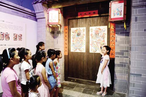 7月30日,小讲解员在武强年画博物馆介绍年画门神。