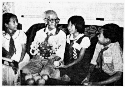 1985年教师节前夕,朝阳区三里屯三小的学生慰问“故事爷爷”孙敬修。杨金华/摄