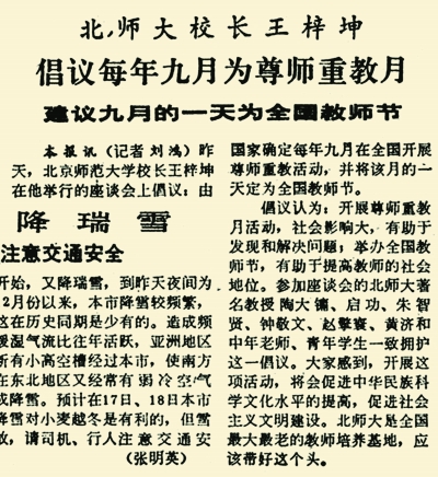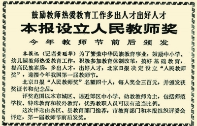 其实,这并非我国第一次提出“教师节”的概念。据本报1985年1月16日1版《何东昌作关于建立“教师节”的说明》一文记载,新中国成立后,1951年教育部和全国教育工会领导人发表书面谈话,宣布“五一国际劳动节”同时为“教师节”。但执行的结果是“教师节”实际上并不存在。