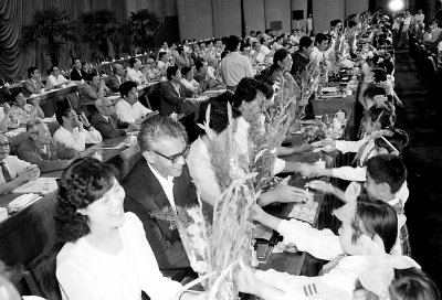 ▲1989年北京市庆祝教师节表彰大会上,少先队员向优秀教师和优秀教育工作者代表献花。叶用才/摄