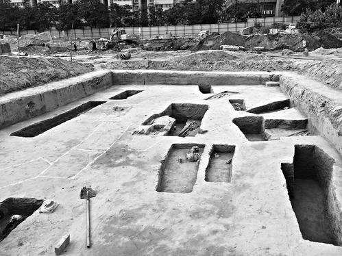 今日15时,记者赶到太原师范学院旧址,发现墓穴的地方位于原师院的东南角,目前,华润地产正在对此处进行开发建设。施工现场,记者看到,此次发现的墓群一共有两处,相隔不远,有工作人员正拿着小铲子一点点地埋头铲土紧张工作。
