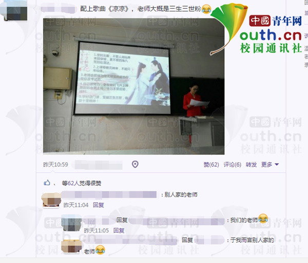 “我也是刚来学校不久,与他们相差也不大,比较了解他们的心理。课上我是老师,课下我更希望我们是朋友。”她笑着说表示,自己也是“三生三世粉”,用这样的劝学体开课比较有趣,让学生更能理解。同时缩小了我师生之间的距离,让大家更亲近。