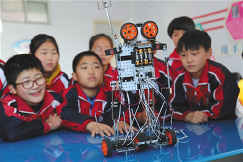 2018年11月22日,河北省承德市营子区滨河路小学学生在练习组装机器人。 图/视觉中国