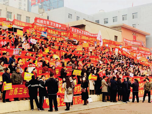 在校园操场上,一条条励志的标语令人备受鼓舞和振奋,给人以梦想和力量。上午10点整,一队队学生方阵在队旗手的引领下,高喊着班级口号雄赳赳气昂昂,伴随着激情的跑操旋律,走到操场中央,“百日高考”誓师大会拉开帷幕。