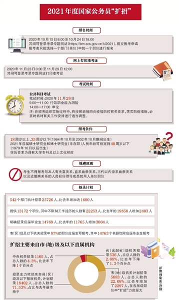 昨日,国家公务员局发布公告,今日8时起至10月24日18时,可报名中央机关及其直属机构2021年度考试。542个部门共计招录25726人,比去年增加近1600人。明确招录应届毕业生14769人,比去年增加3004人。