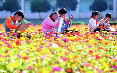 江西宜春市袁州区寨下镇中心小学的学生们在花田写生。新华社发