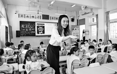 在广东深圳市福田区南园小学,教师黄晓蕾在英语课上与孩子们互动。新华社发