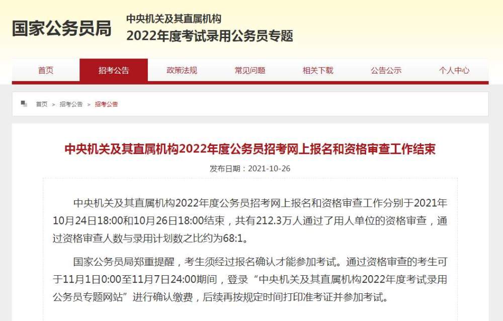 据国家公务员局网站消息,中央机关及其直属机构2022年度公务员招考网上报名和资格审查工作分别于2021年10月24日18:00和10月26日18:00结束,共有212.3万人通过了用人单位的资格审查,通过资格审查人数与录用计划数之比约为68:1。