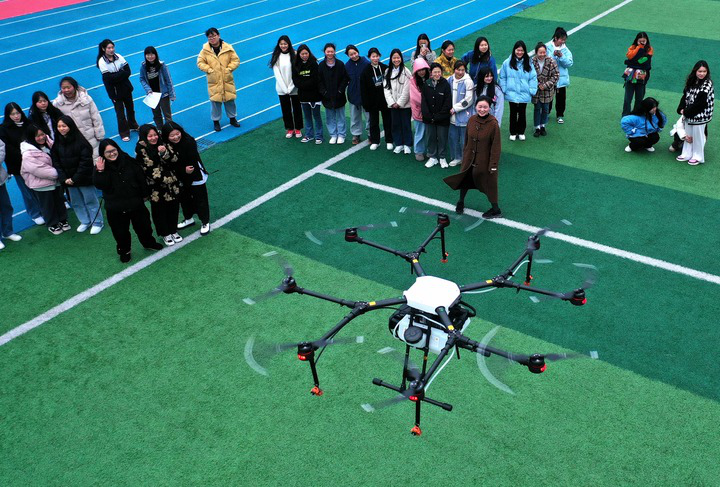 2022年3月2日,在宣恩县中等职业技术学校,学生观摩植保无人机飞行操作(无人机照片)。新华社发(宋文摄)