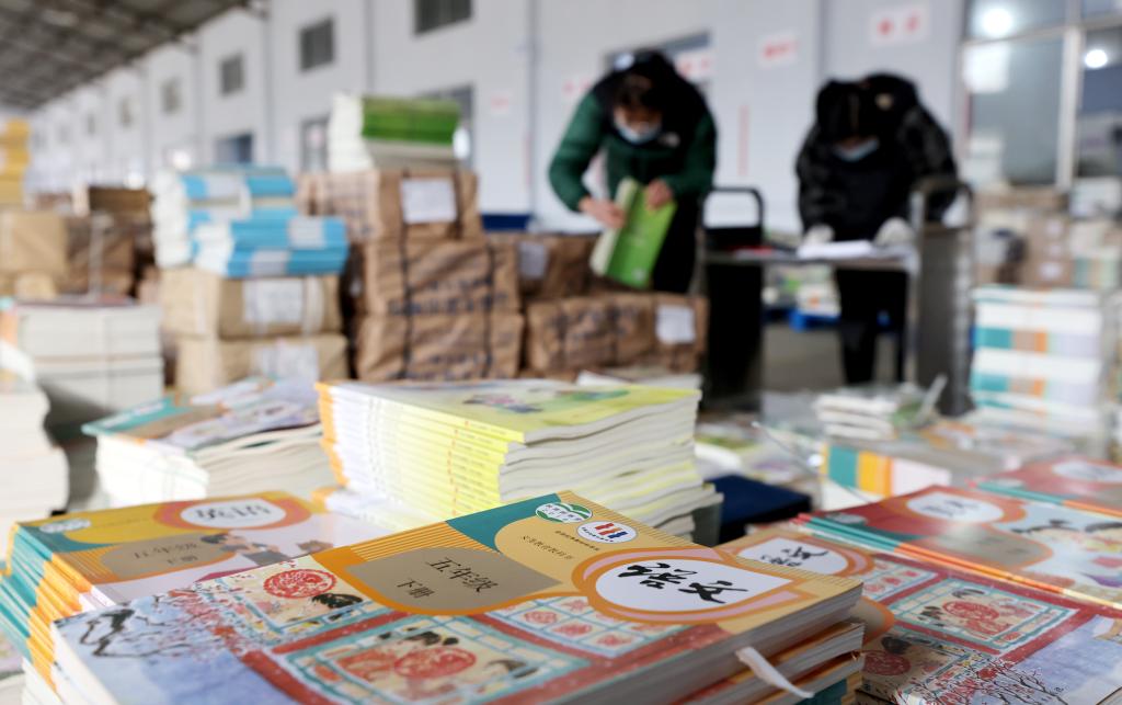 2022年2月13日,在山东省枣庄市新华书店教材发行中心,工作人员在分拣教材。新华社发