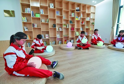 在浙江省嘉兴市儿童青少年心理健康服务总站,学生们在体验“脑波球”。新华社发