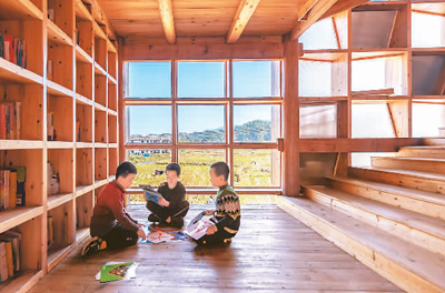 据介绍,坪坦书屋位于湖南省怀化市通道侗族自治县坪坦乡侗族村一所有400多名学童的小学庭院内,于2021年底启用。这栋建筑物楼高3层,面积约180平方米,完全以木材建造。书屋继承了传统侗族建筑的特色,由两个交错的螺旋楼梯组成,采用瓦片坡屋顶和榫卯相扣的柱梁木结构系统,既可让孩子们阅读,也可让他们玩耍和探索。(陈然)