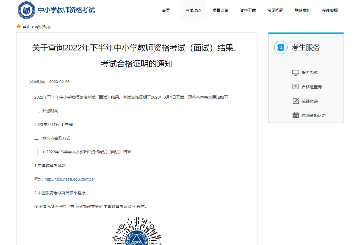 2022年下半年中小学教师资格考试(面试)结果、考试合格证明于2023年3月1日开放,现将有关事宜通知如下: