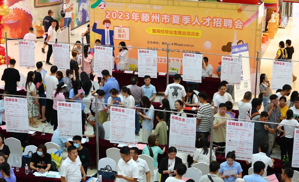 2023年7月15日,求职者在山东省滕州市举行的夏季人才招聘会暨高校毕业生就业洽谈会上了解岗位信息。新华社发(李志军 摄)