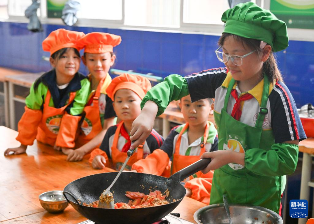 9月20日,重庆市忠县乌杨小学厨艺社团的学生在学习、体验炒菜。