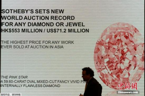 中新网4月5日电 据外媒报道,近日,重达59.60克拉、一颗被称为“粉红之星”的罕见钻石在香港拍卖的价格超过了7100万美元,刷新了全球钻石的拍卖纪录。