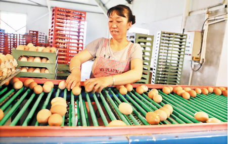 原平农商行积极开展“三大四扫五进”活动,让普惠金融的触角向乡村不断延伸,精准对接县域种养大户,支持种养业发展。今年,该行为原平市兴崞养殖专业合作社提供400万元信贷资金,解决了企业流动资金不足的问题。图为专业合作社的工人在车间分捡鸡蛋。赵 鸿 摄