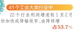 统计数据显示,在41个工业大类行业中,有22个行业利润增速较1至2月份加快或降幅收窄、由降转增,占53.7%。