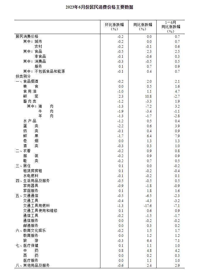 2023年6月份居民消费价格同比持平 环比下降0.2%