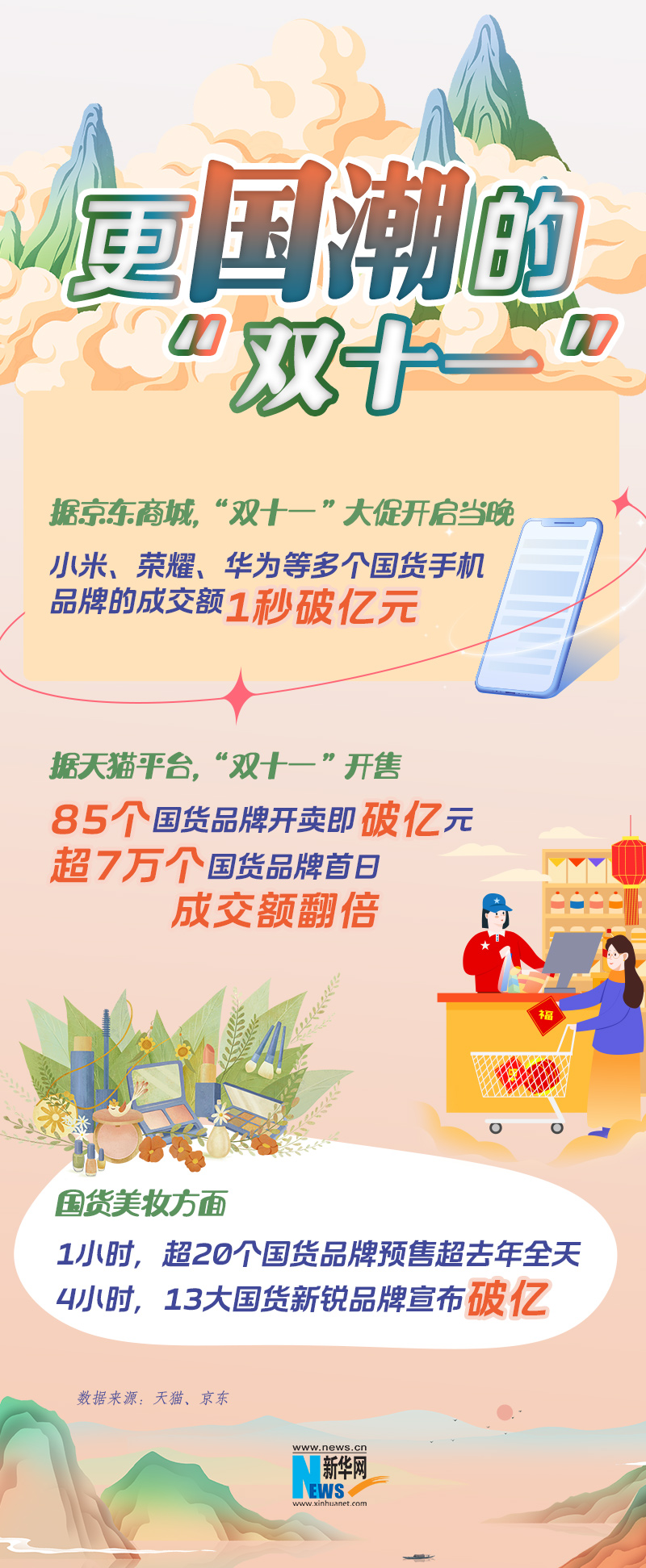 公开数据显示,10月23日京东“双十一”开启当晚,小米、荣耀、华为等多个国货手机品牌的成交额1秒破亿元;10月31日晚天猫“双十一”正式开售,85个国货品牌开卖即破亿元,超7万个国货品牌首日成交额翻倍。