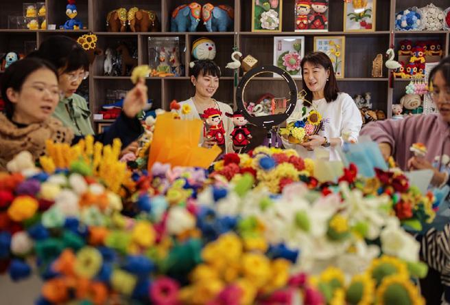 2023年11月9日,山东省荣成市巾帼创业孵化基地,妇女创客在包装毛线编织手办、花束订单,迎接“双十一”购物高峰。新华社发(李信君 摄)