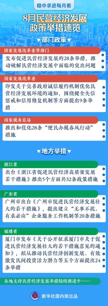 8月份以来,针对民营企业面临的痛点、堵点、难点,从中央到地方密集推出系列政策举措,旨在激发民间投资活力,鼓励企业敢闯、敢投、敢担风险。
