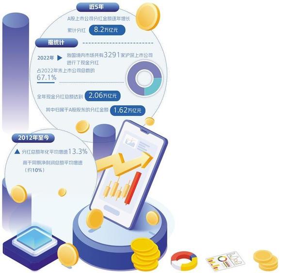 近5年,A股上市公司分红金额逐年增长,累计分红8.2万亿元。据统计,2022年,我国境内市场共有3291家沪深上市公司进行了现金分红,占2022年末上市公司总数的67.1%,全年现金分红总额达到2.06万亿元,其中归属于A股股东的分红金额1.62万亿元。国际比较来看,境内市场分红上市公司数量在全球主要证券市场中位居第一,现金分红总额位列全球第二,分红家数占比位列全球第二。此外,有163家上市公司公布2023年半年报现金分红预案,预计分红2030.1亿元。