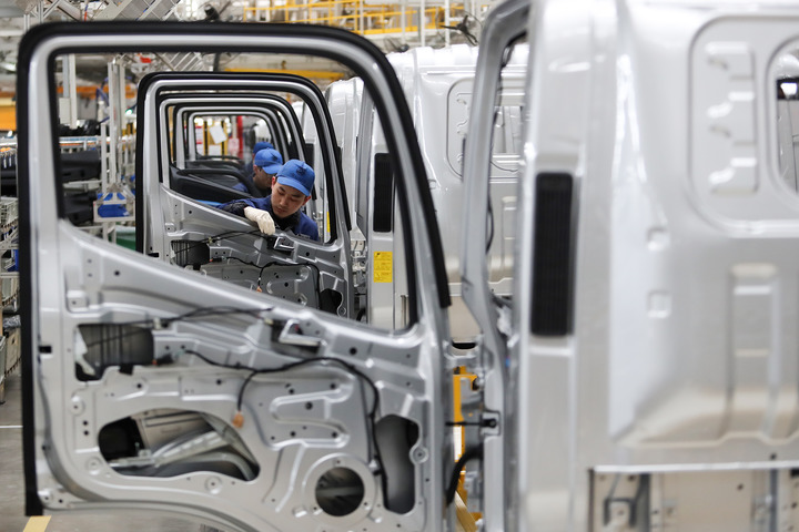2024年1月8日,河南商丘首批地产新能源轻卡车下线,工人在组装车间工作。新华社发