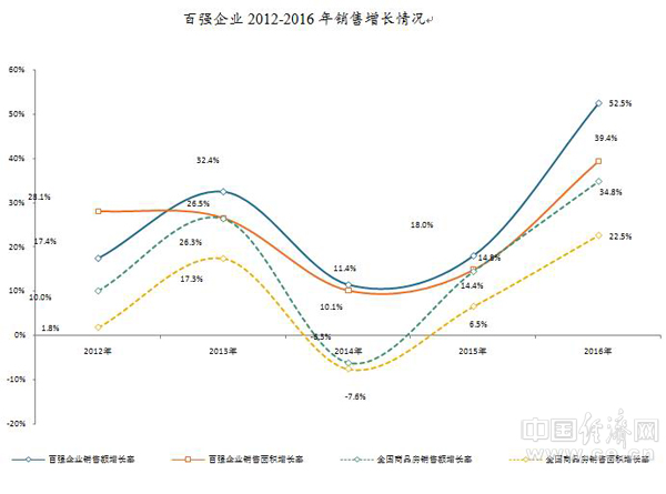 2016年百强企业凭借准确的市场研判、契合主流的市场布局与产品架构,实现新一轮的跨越式发展,销售规模加速提升,市场份额突破四成。销售总额、销售面积分别达48027.1亿元、40251.7万平方米,同比增长52.5%和39.4%。受益于规模和品牌效应的持续扩大,百强企业销售额和销售面积增长率分别高于同期全国增幅17.7、16.9个百分点,行业领先优势进一步彰显。