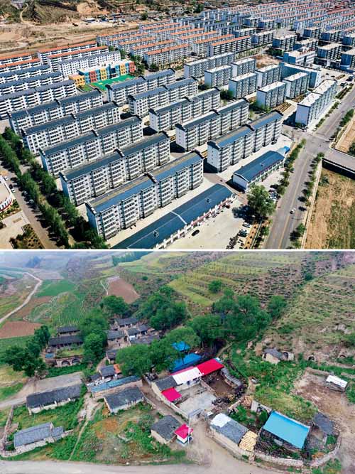近年来,山西坚持抓减负、重落实,把基层工作聚焦到乡村振兴与脱贫攻坚、社区服务与基层治理、服务中心与保障大局上来。目前,山西全省58个贫困县已全部摘帽,3350个深度贫困自然村整体搬迁全部完成。图片为拼版照片,上图为2020年5月20日拍摄的山西省忻州市岢岚县广惠园移民新区,下图为2017年6月22日拍摄的岢岚县赵家洼村,部分赵家洼村村民目前已搬迁居住到了广惠园移民新区。 新华社记者 曹阳/摄