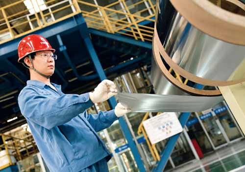 山西坚定贯彻落实习近平总书记关于创新驱动、科教兴国、人才强国的重大战略思想,手撕钢、碳纤维、碳化硅等技术创新取得重大突破。图为太钢集团生产车间正生产手撕钢。该公司2018年研发的宽幅精密带钢箔材(厚度0.02毫米,宽640毫米)成为世界首创,因其厚度不到头发直径的1/3、比A4纸还要薄、可以用手轻易撕开,被形象地称为“手撕钢”。 山西省委宣传部供图