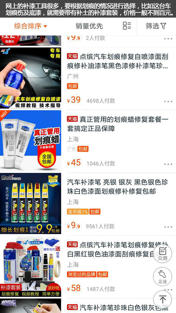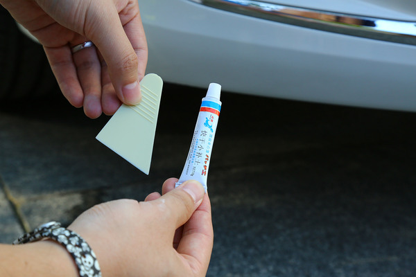可以看到这辆车的划痕伤至底漆了,为了更好的固漆,我们需要进行简单的补土或者叫打腻子,对凹凸不平之处也可以很好的找平。这种小管的补土很便宜,电商卖10元左右,而全套的补漆工具不足百元。
