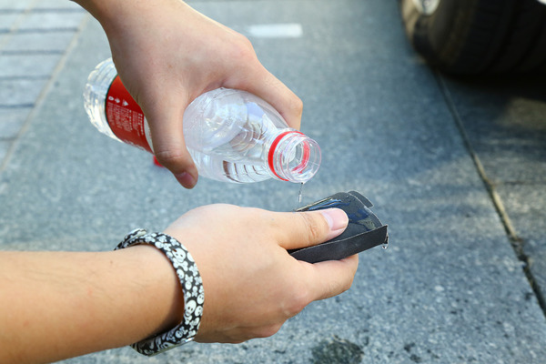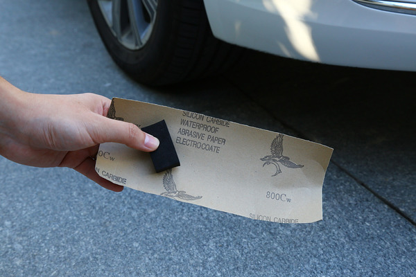 开始补漆作业,先清洗划痕位置以及周围地方。先用800的砂纸进行打磨,垫上一块垫木沾一些水,可以更好掌握砂纸打磨时的力度。将划痕处的漆面以及伤痕打磨平整并再次清洗擦干。