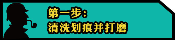 接下来要用更加精细的2000砂纸,将划痕周围区域也就是原来旧漆的位置进行打磨,打磨成哑光状态,并清洗干净,以便之后划痕周围上漆更加均匀和牢固。