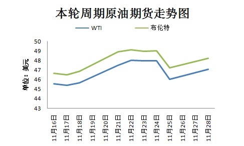 本轮计价周期内,国际原油价格呈现先涨后跌再涨态势。截至11月28日收盘,当日,美国WTI原油期货涨1.02美元,报收47.08美元/桶;布伦特原油期货涨1.00美元,报收48.24美元/桶。