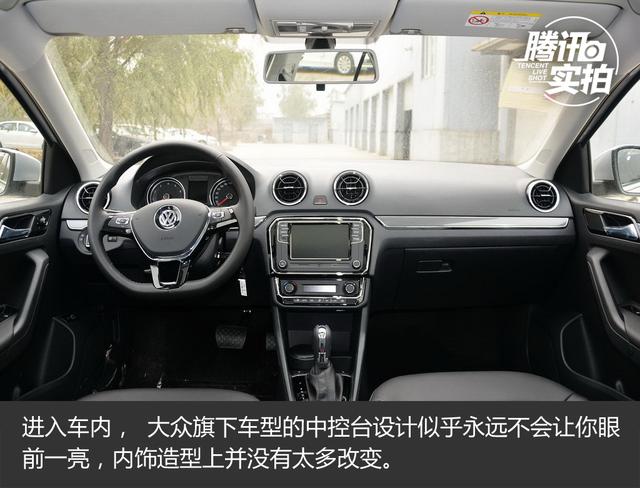 进入车内, 大众旗下车型的中控台设计似乎永远不会让你眼前一亮,内饰造型上并没有太多改变。全新三辐平底方向盘是最大改变,盘辐大小正好,握感也很不错,钢琴烤漆的饰条更是点睛之笔,两侧多功能按键可以控制多媒体和蓝牙电话等功能。仪表盘的底纹有所改变,黑底白字清晰易读,中央是单色行车电脑显示屏。车内空调出风口造型有所调整,内部构造更加复杂。