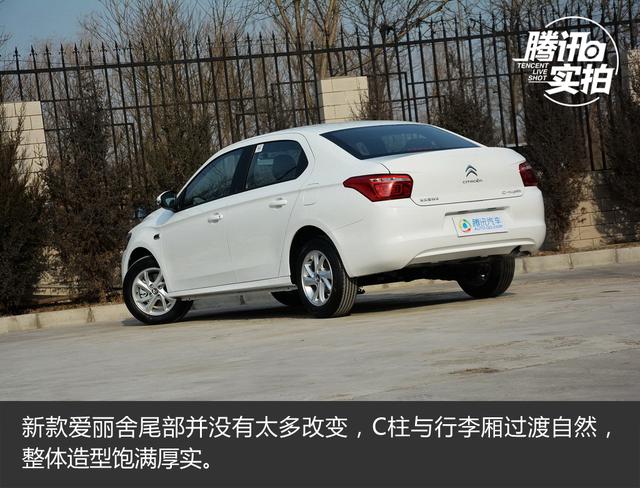 车身侧面没有使用太多的线条勾勒,腰线从前大灯一直延伸至车尾,因此整体看起来比较简洁。轴距依旧为2652mm,同现款车型没有变化。双色后视镜上增加了镀铬饰条和LED转向灯,视觉效果出色,具备电动调节功能。前翼子板之前放置转向灯的位置,被一块“C-ELYSEE”的铭牌所替代,看上去更显精致。升级为全系标配铝合金轮毂,造型美观的同时安全系数高,同时前后制动系统都采用盘式制动器。轮胎使用万力HARMONIC H220,尺寸为185/60 R15。