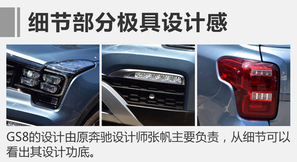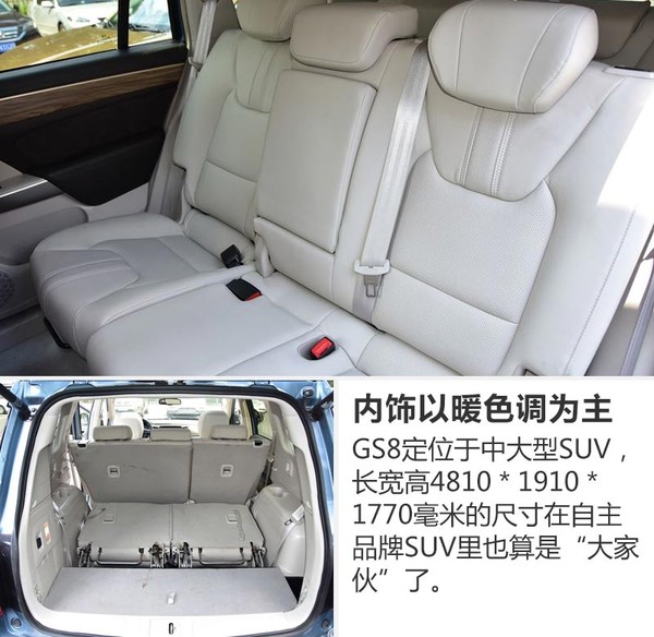 GS8的设计由原奔驰设计师张帆操刀,在内饰部分也较为洞察国内消费者的喜好。车内整体宽敞舒适,颜色采用偏暖的木色,打造一种家用温馨感。空间方面,GS8的长宽高分别为4810*1910*1770毫米,轴距2800毫米,采用7座布局。