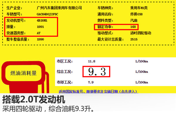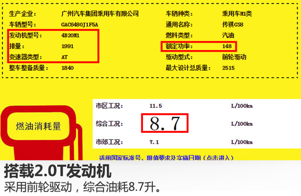 动力方面,从国家工信部公布的信息可知,广汽传祺GS8将搭载一台型号为4B20M1的2.0升直列四缸涡轮增压发动机,额定功率148千瓦,匹配6速自动变速箱。百公里综合油耗分别为:两驱车型8.7升,四驱车型9.3升。
