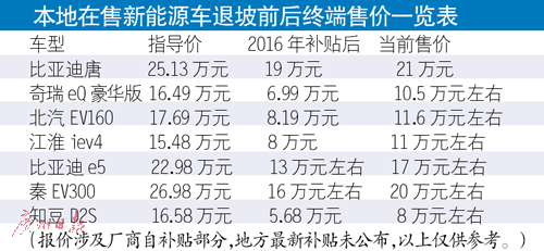 车天下记者近日走访广州本地市场看到,受到补贴减少的新政影响,新能源汽车出现价格上涨态势。记者在北汽、奇瑞、比亚迪等新能源车销售店里看见,一些新能源车车型已经调价。一辆原本在去年补贴后售价为6.28万元的纯电动汽车,现在挂出来的售价为9.88万元,上涨将近一半多;比亚迪旗下多款续航里程在300公里以上的新能源汽车,平均上调4.4万元。