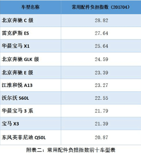 常用配件负担指数方面,在汽车零整比系数基础上,挖掘事故车维修数据,选取配件损失率大于 1%的常用配件进行研究,导入计算公式核算各车型的常用配件负担指数。在样本车型中最高的车型为北京奔驰 C级,常用配件负担指数为 28.82;最低的车型为哈弗 H6,常用配件负担指数为 9.32。