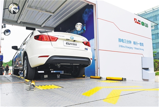 7月5日,北汽新能源首款对私换电车型在换电站样板间展示如何快速换电。 新华社记者 罗晓光摄