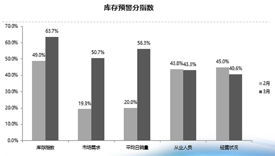 从库存预警分指数来看,库存指数、市场需求指数、平均日销量指数环比上升;从业人员指数、经营状况指数环比下降。郎学红表示,市场需求和日均销量有明显提升,然而由于经销商主动增加库存和增值税调整带来的消费者观望,使得经营状况并未出现好转。