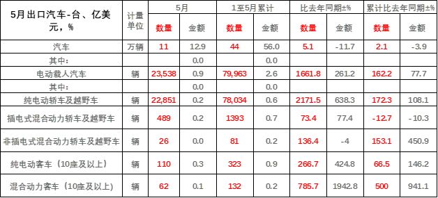 5月,我国出口汽车10.6万辆,同比增长5.1%。其中,新能源汽车出口2.35万辆,同比增长1661.8%。崔东树认为,新能源汽车对车市实现高质量增长具有一定的拉动作用,同时也是国内汽车出口实现正增长的强大动力。
