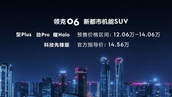 2020年7月24日,领克06于成都车展公布了型Plus、劲Pro、耀Halo三款车型的预售价格,区间为12.06-14.06万,并于7月24日下午16:06于领克商城开启线上预订。同时,首发600台科技先锋版,价格为14.56万,将于8月6日16:06在领克商城开启抢订。