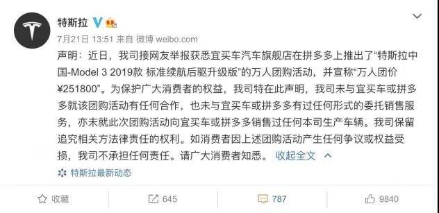 特斯拉在微博上对于拼多多“团购”的声明截图。